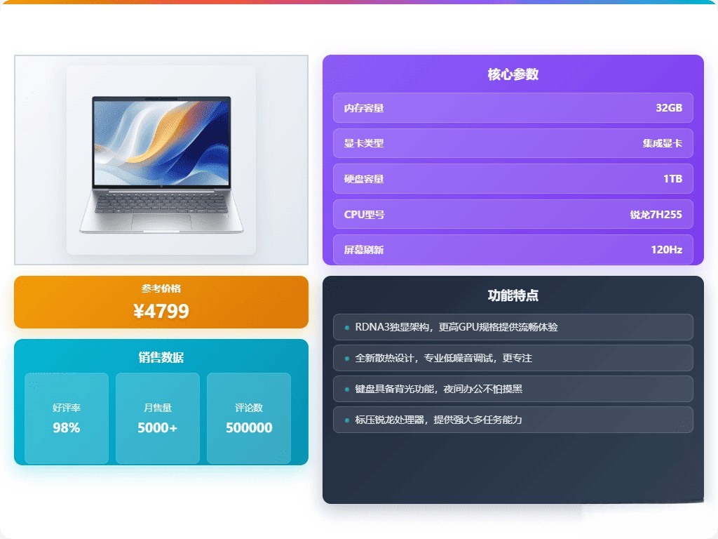 2.强悍性能:这款笔记本搭载了标压的锐龙7 H255处理器,最高主频可达4.9GHz,运行多任务时特别顺畅,不会卡顿。加上32GB的大内存,可以同时开很多程序也丝毫没有压力,让你办事更得心应手。