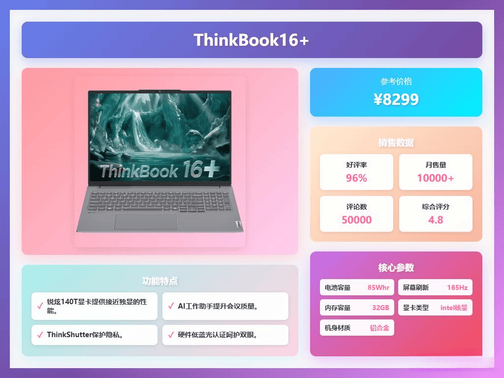 2.大屏视觉体验:这款笔记本配备了16英寸的3.2K高分屏,色彩还原接近专业级,画质细腻,显示更精准。支持高达165Hz的刷新率,不卡顿,玩游戏和看影片都非常顺畅,让你在大屏上享受更沉浸的视界。