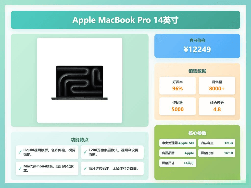 1.强大性能:Apple MacBook Pro搭载的最新M4系列芯片,速度提升最高可达3.5倍,无论是图形处理还是AI任务,都能轻松应对,运行特别顺畅,让你多任务处理变得更简单。而且,16GB的内存容量也算是挺够用的,日常工作、娱乐都没问题。