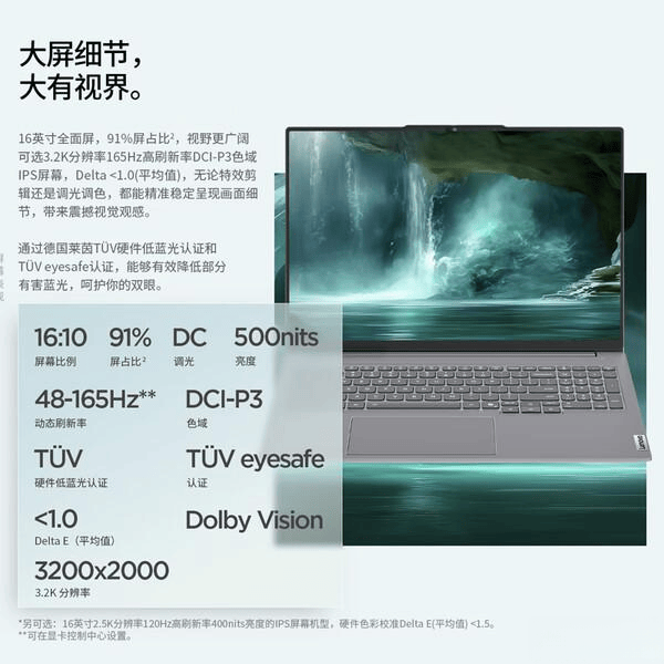 在挑选大屏笔记本时,首先要关注屏幕素质,这直接决定了你的使用体验。别光看尺寸,分辨率、色域、刷新率这三个指标才是关键。一般来说,2.5K甚至更高的分辨率,才可能正真的保证画面足够细腻;100% sRGB或DCI-P3色域,能让色彩更准确、更鲜艳。而120Hz以上的高刷新率,则能带来更流畅的视觉体验,无论是打游戏还是看视频,都能明显感觉到丝滑顺畅。当然,如果经常需要长时间使用电脑,护眼功能也要考虑进去,比如DC调光可以有实际效果的减少屏幕闪烁,减轻眼部疲劳。